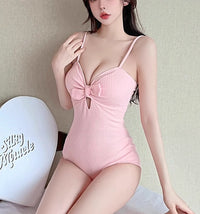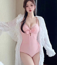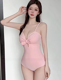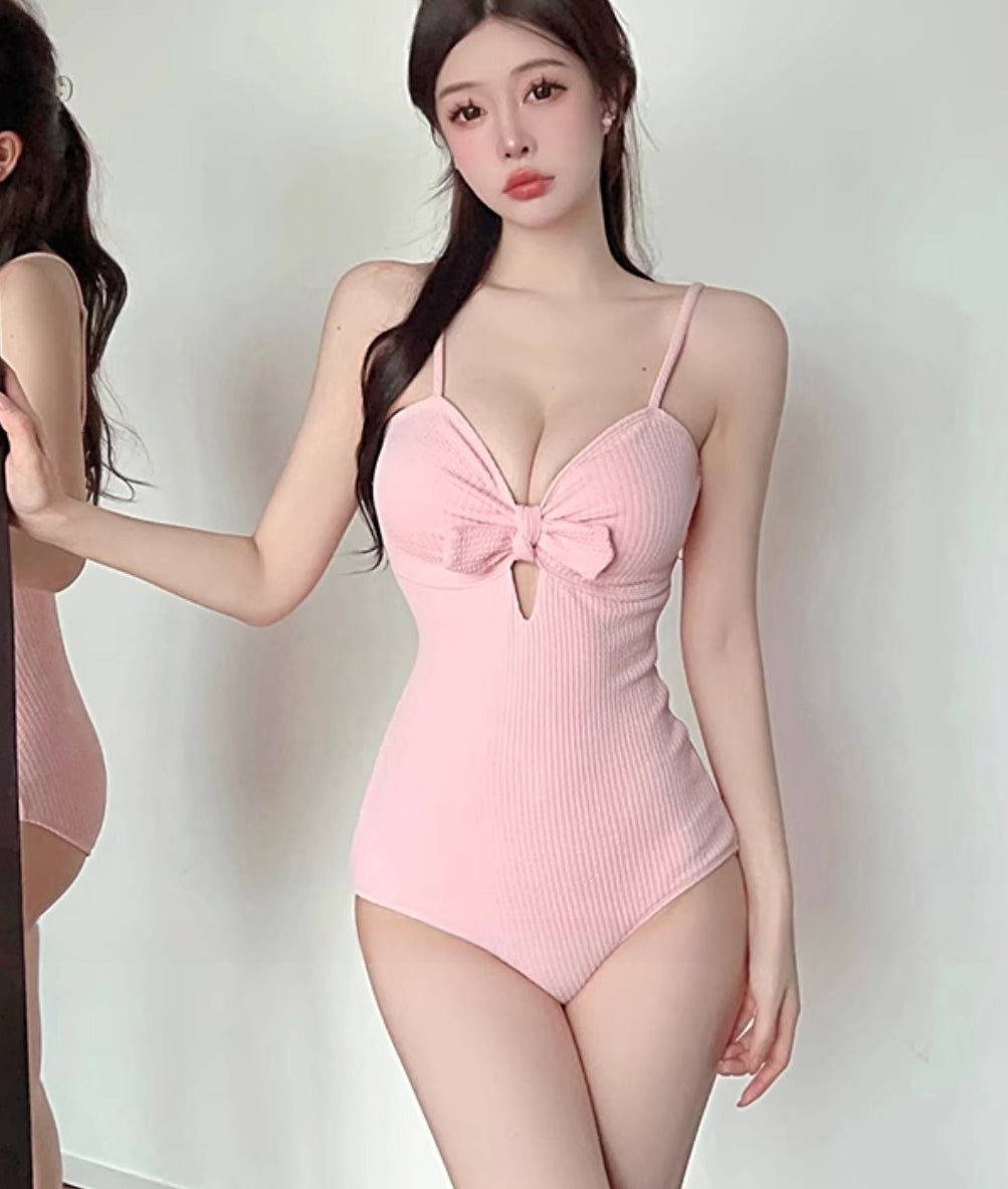 A refreshing and youthful one-piece swimsuit featuring a charming bow detail and a subtle cutout at the chest for a touch of delicate allure. The baby pink macaron color adds a playful, age-defying vibe. Perfect for those who prefer a more modest yet stylish swimwear option.