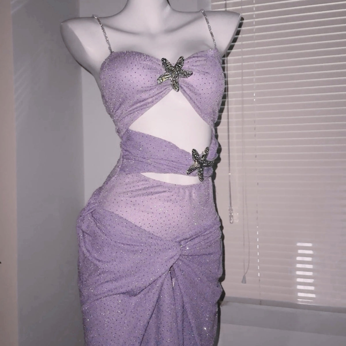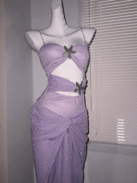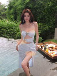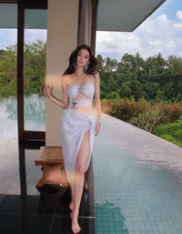A stunning swimsuit set that shines brilliantly under the sun, thanks to its shimmering silver-threaded fabric. The waist cutout design creates a flattering, slimming effect, while the matching slit skirt adds a stylish touch.