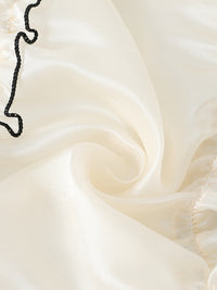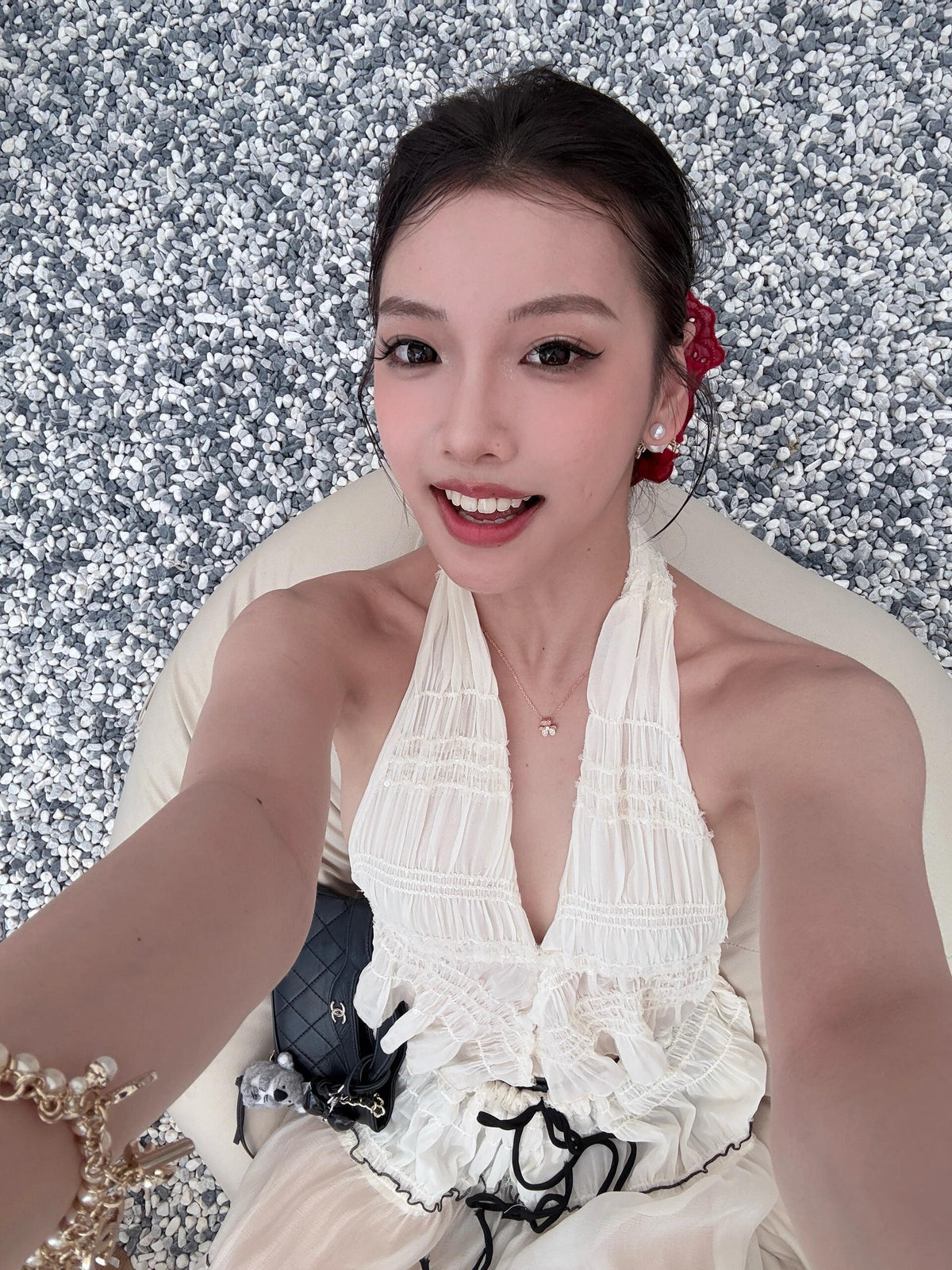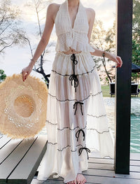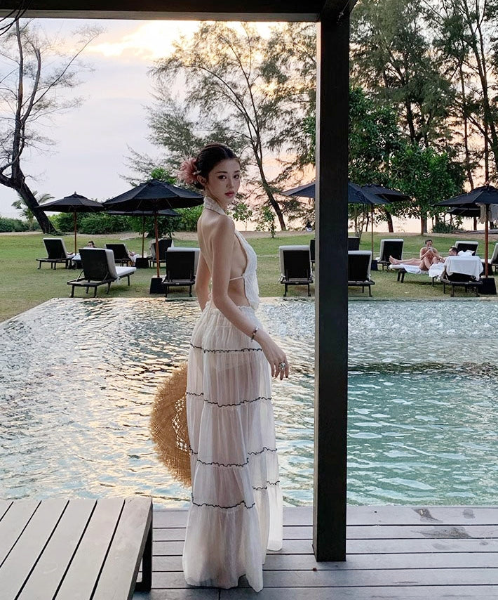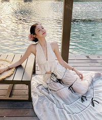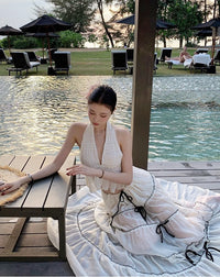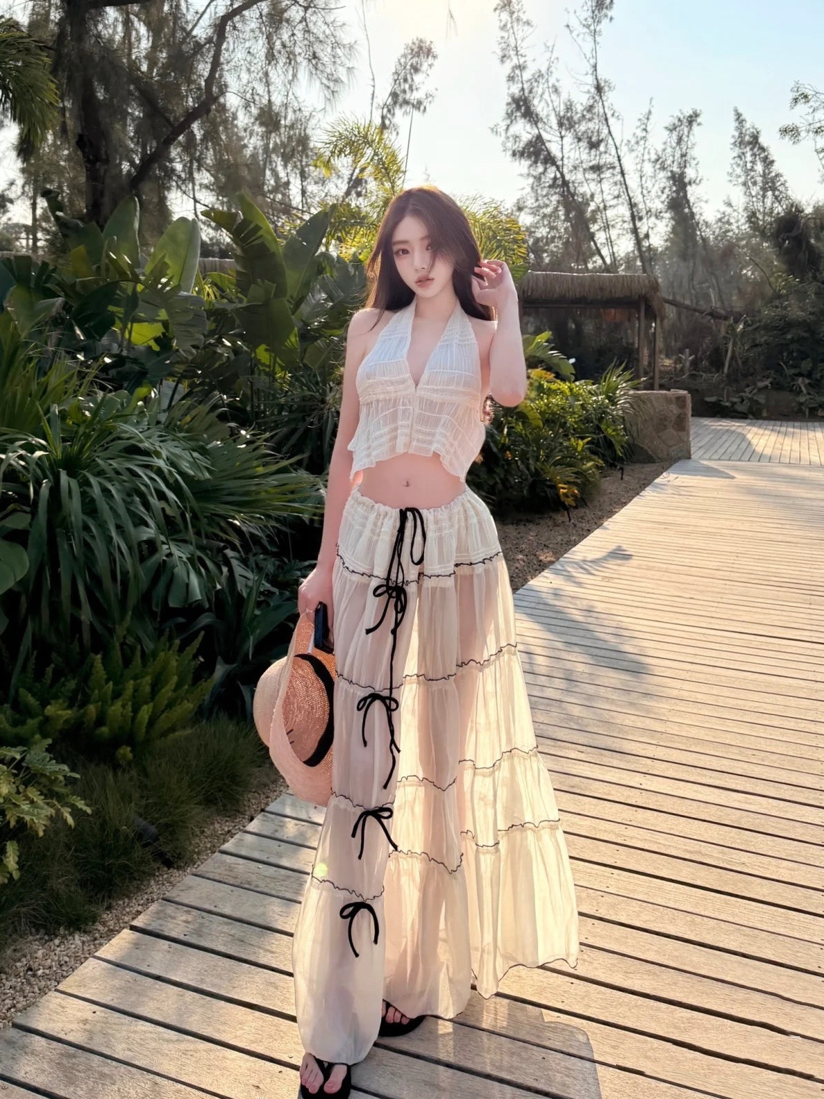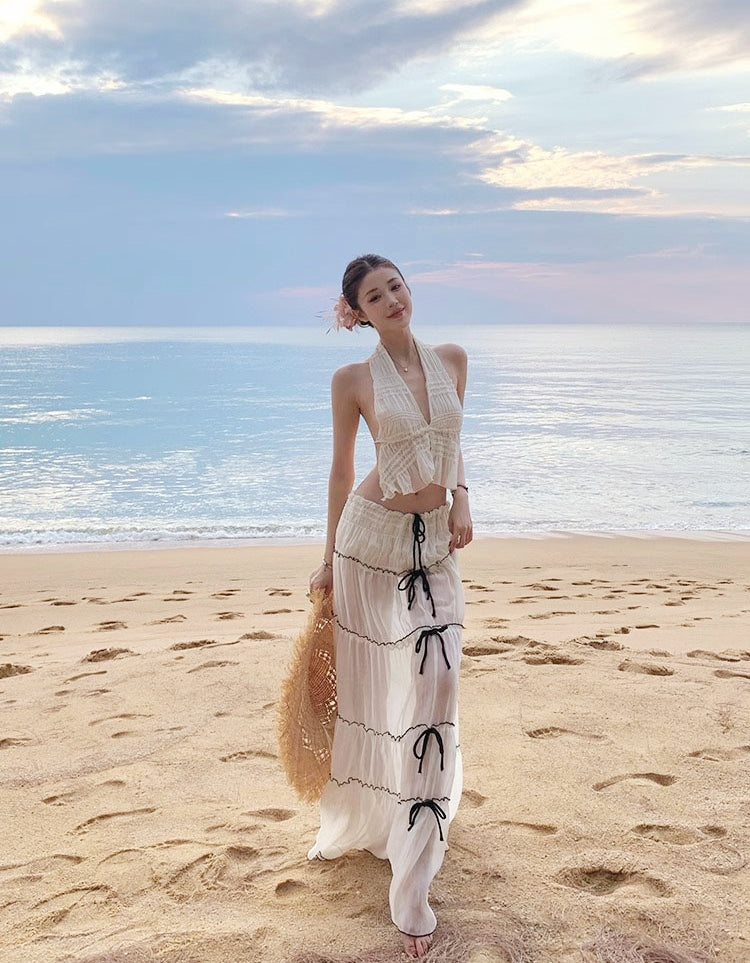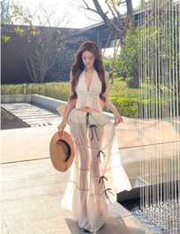 A sultry halter-neck deep V design with a delicate pearlescent sheen and semi-sheer finish, this set captures the perfect balance of allure and elegance. Made from premium textured fabric with exquisite detailing, it's designed to shine in photos. The inner swim shorts are water-ready, making it suitable for both swimming and beachwear. A versatile set that transitions effortlessly from beach to poolside.