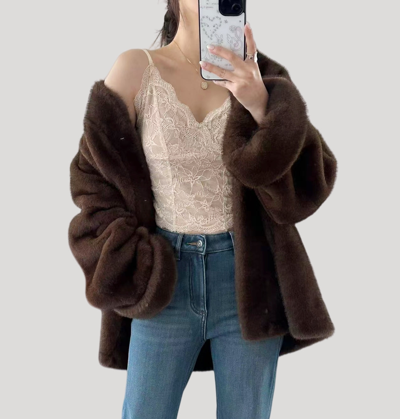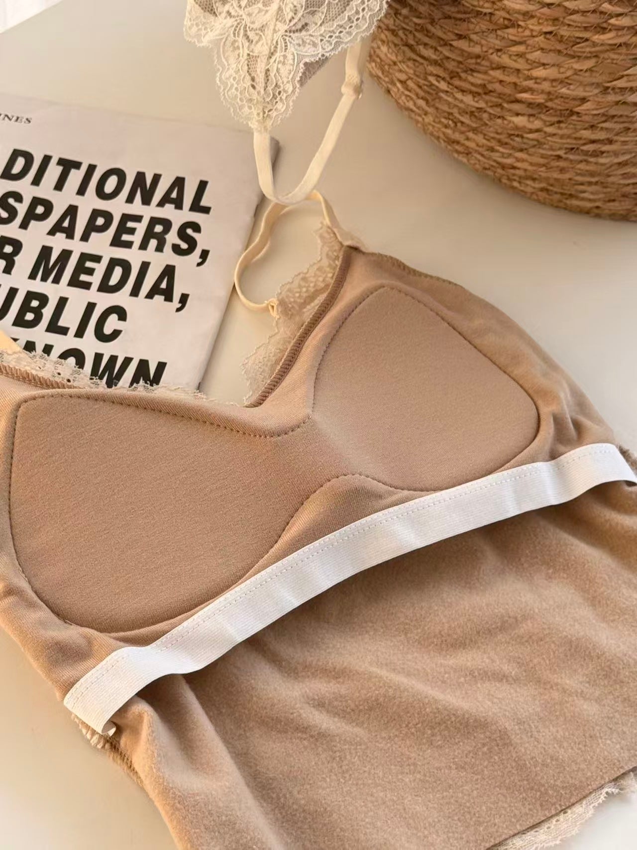 A romantic French-style lace camisole with a soft brushed finish. Sheer lace creates a subtle see-through effect, while the V-neck beautifully highlights the collarbone. The mocha tone feels refined and premium. Designed with a teardrop cup structure that is thinner on top and thicker at the base, giving a naturally rounded, lifted shape with great support.