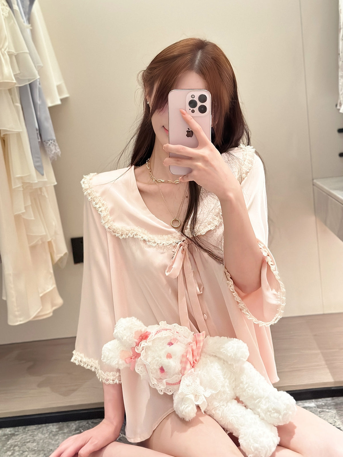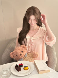 Crafted from ultra-soft silk that feels gentle on the skin, this set features a princess-style oversized doll collar for a charming, girly look. Perfect for staying cozy at home while keeping a delicate and refined style.