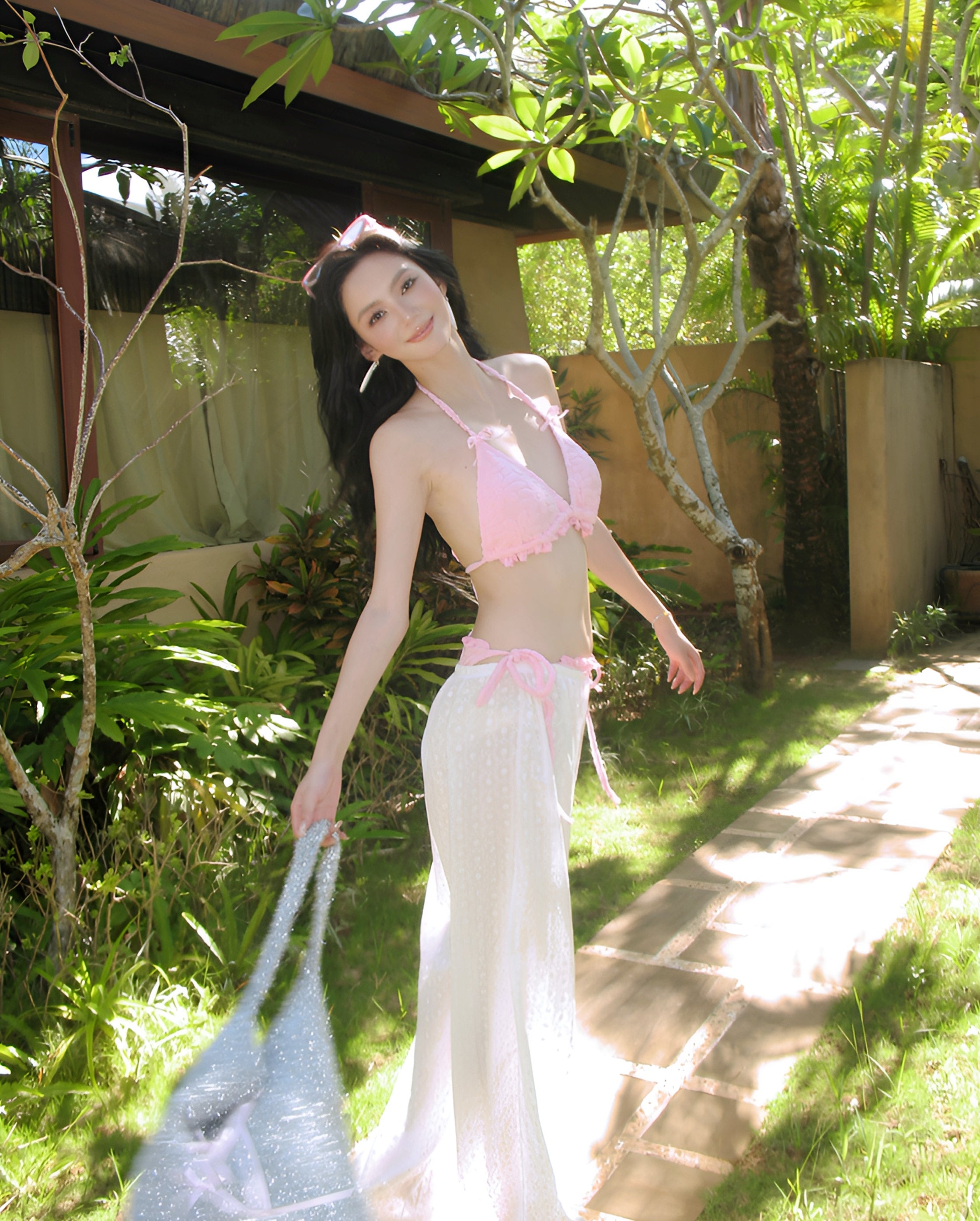 A super trendy INS-style swimsuit in creamy pink ice-cream tones, paired with wide-leg white pants for a cute contrast. The 3-piece set can be worn as swimwear or as a casual outfit for going out. Perfect for beach trips and photos—very photogenic. Bikini top includes built-in padding, suitable for both small and fuller busts.