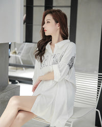 This loose-fit nightdress brings an effortlessly chic and relaxed vibe. Made from silky smooth ice-silk fabric, it feels gentle on the skin while offering a natural drape. The mid-length design falls just below the hips, creating a flattering “no-pants” look that’s perfect for lounging at home in style.