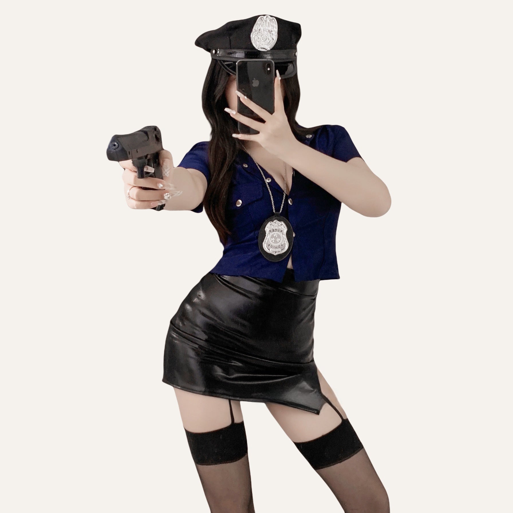 IPolice Officer-Inspired Bodycon Leather Skirt Costume Set, complete with a police hat, badge, stockings, and gloves. This daring set features a form-fitting leather skirt that accentuates curves, combining style and allure for a playful and memorable look.