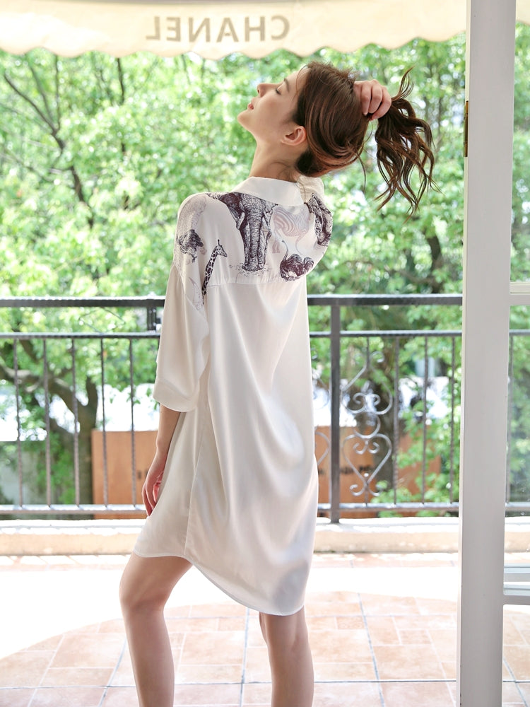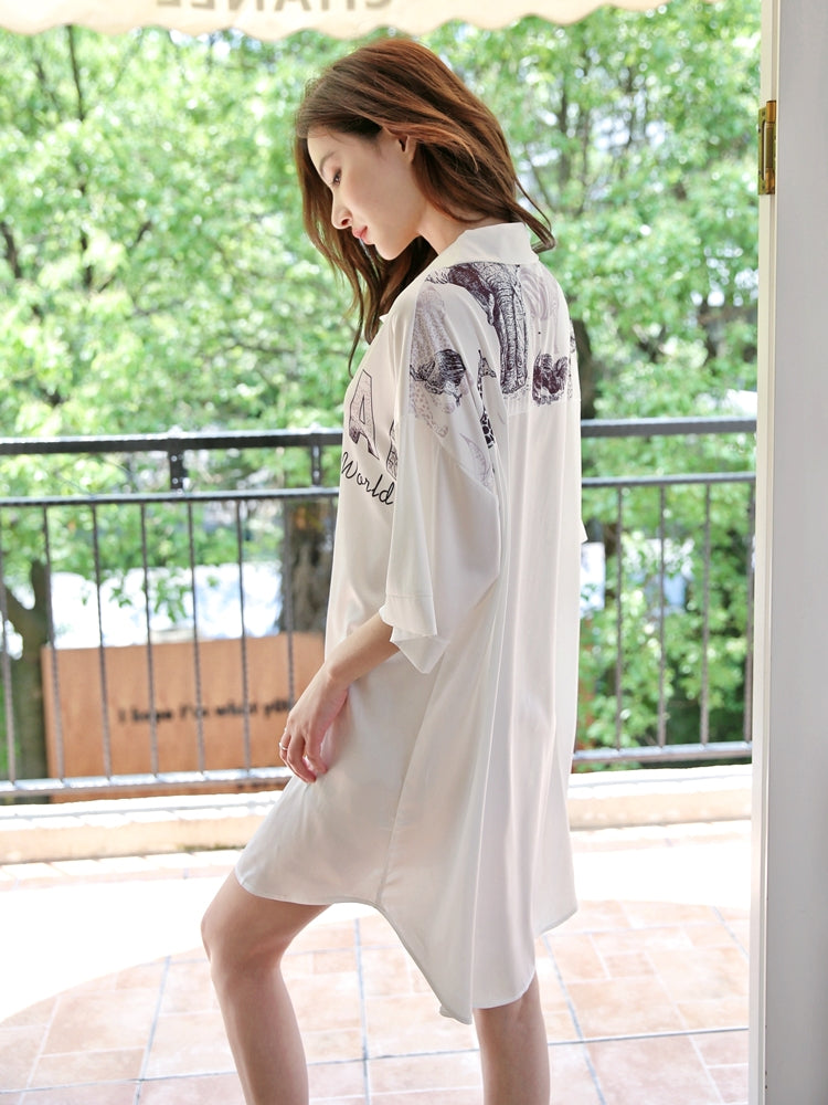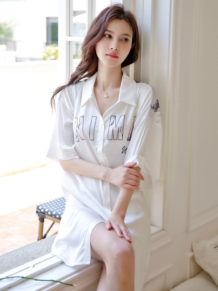 This loose-fit nightdress brings an effortlessly chic and relaxed vibe. Made from silky smooth ice-silk fabric, it feels gentle on the skin while offering a natural drape. The mid-length design falls just below the hips, creating a flattering “no-pants” look that’s perfect for lounging at home in style.